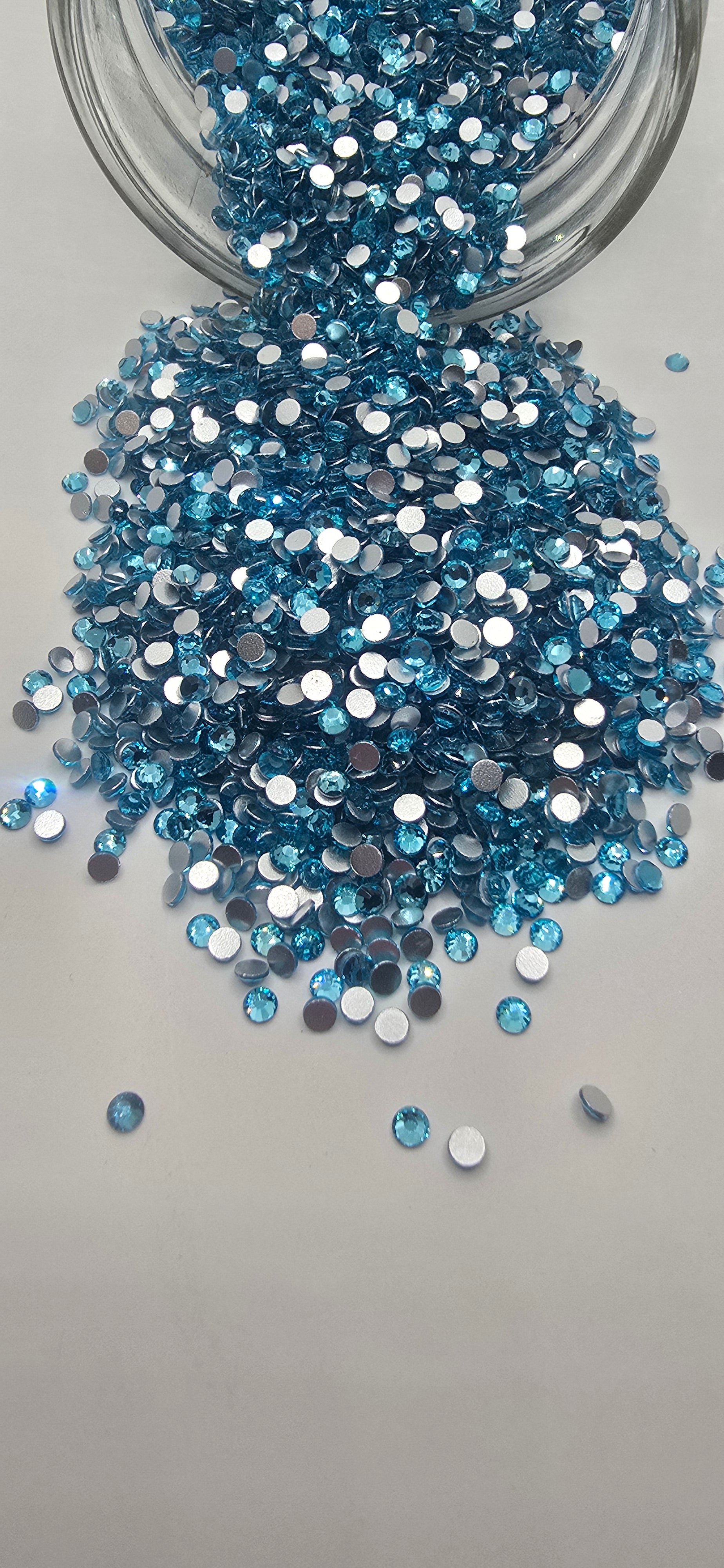 Light blue in color glass flatback rhinestone.