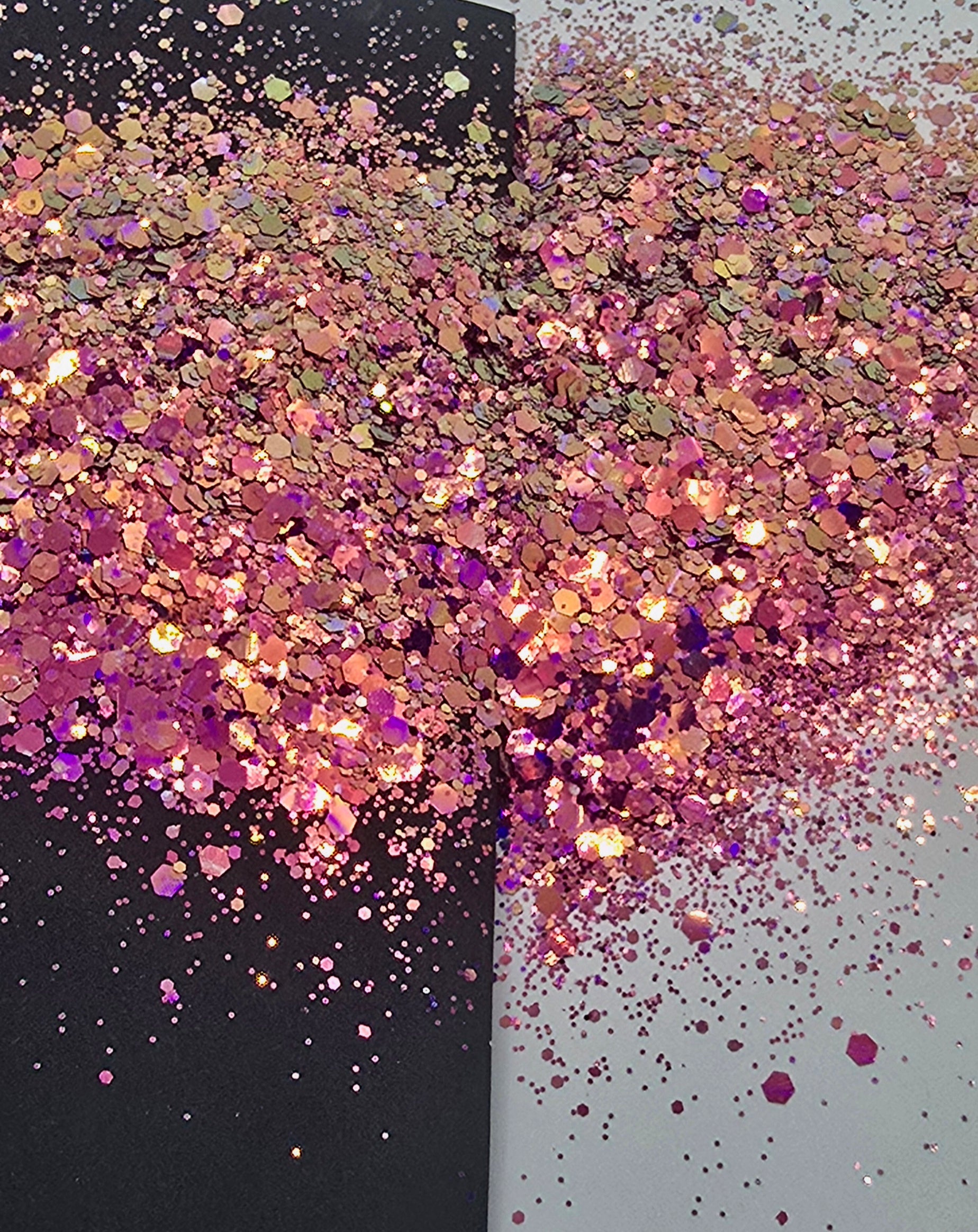This is a Chunky mix glitter with a color shift from a dark pink to a gold color.