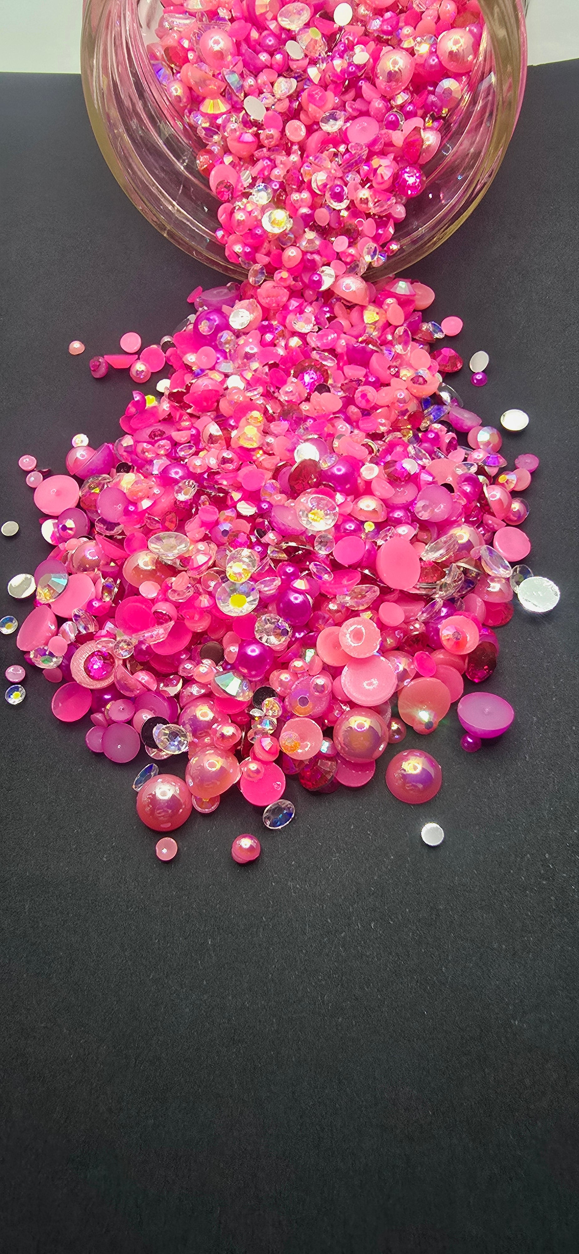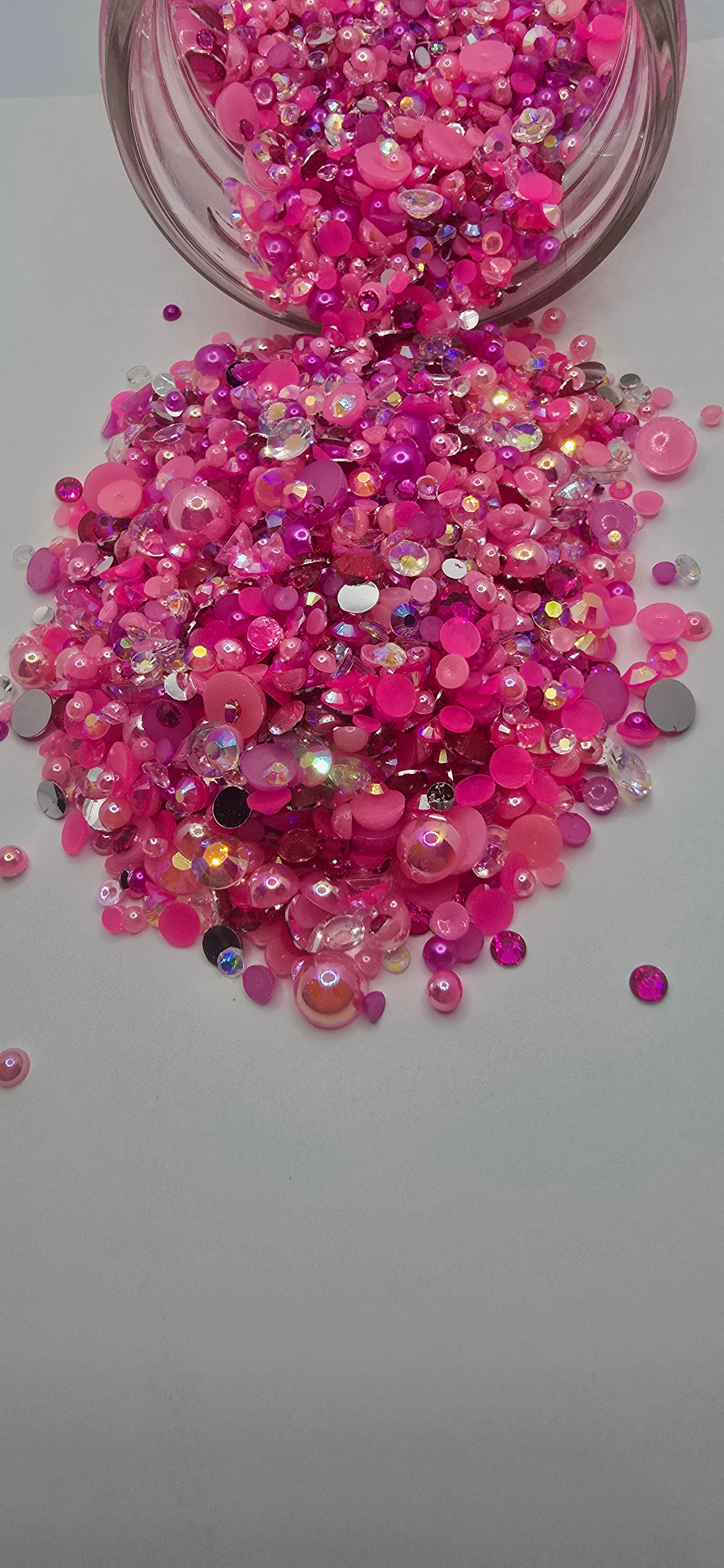 Different colored pinks and a clear diamond rhinestone mix. 3-10mm in size.
