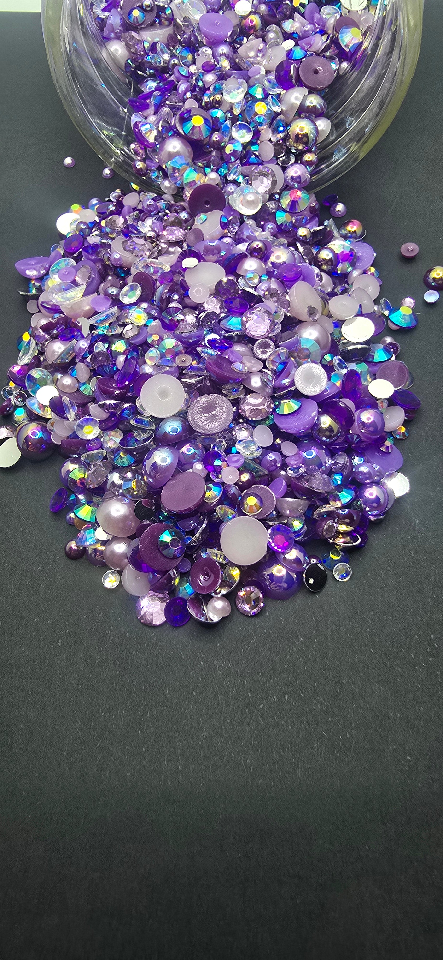Different colored purples and a clear diamond rhinestone mix. 3-10mm in size.
