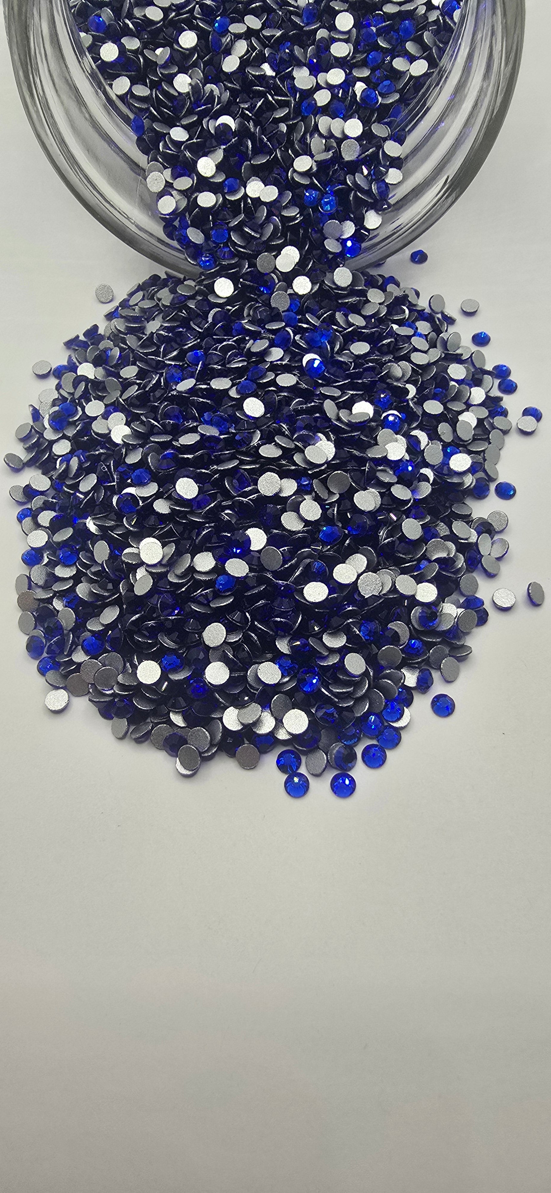 Dark blue in color glass flatback rhinestone.