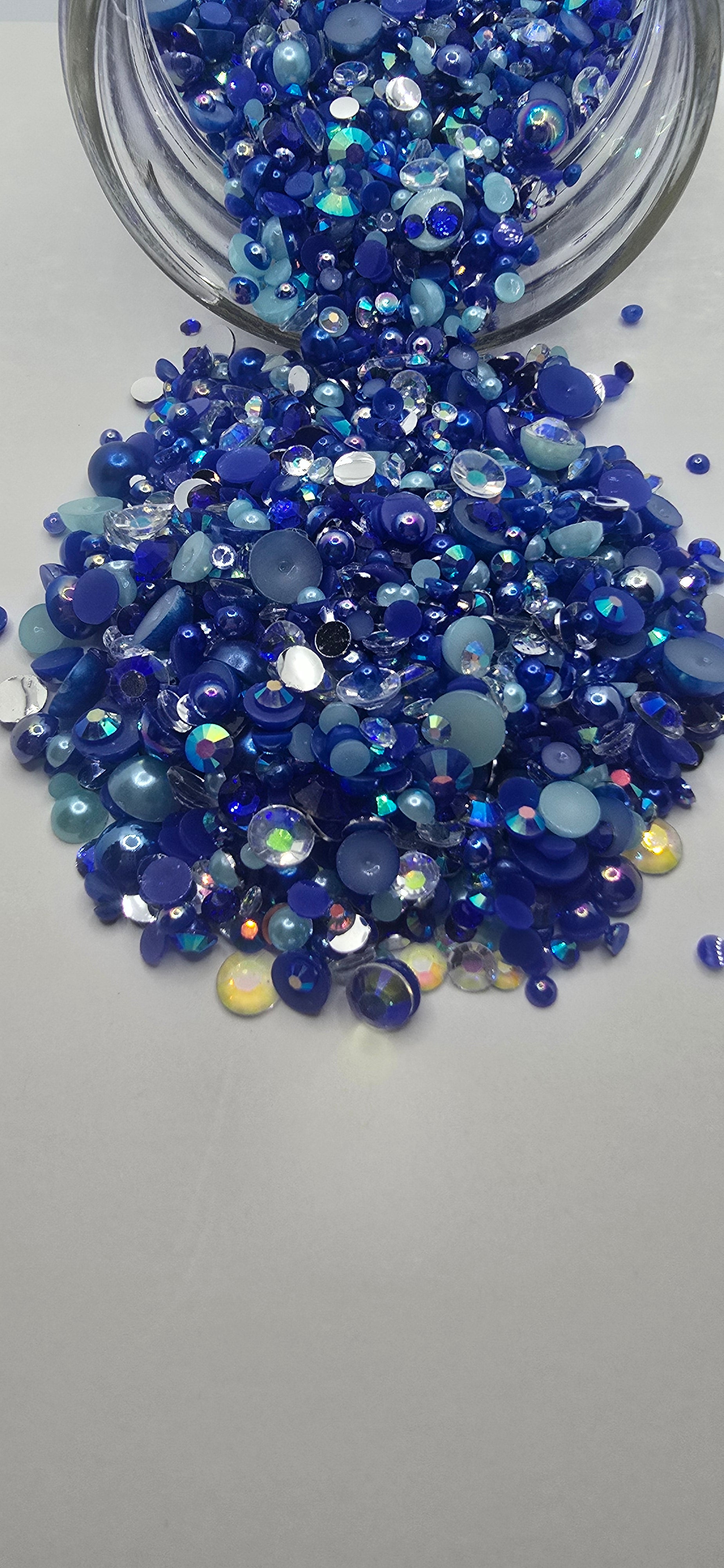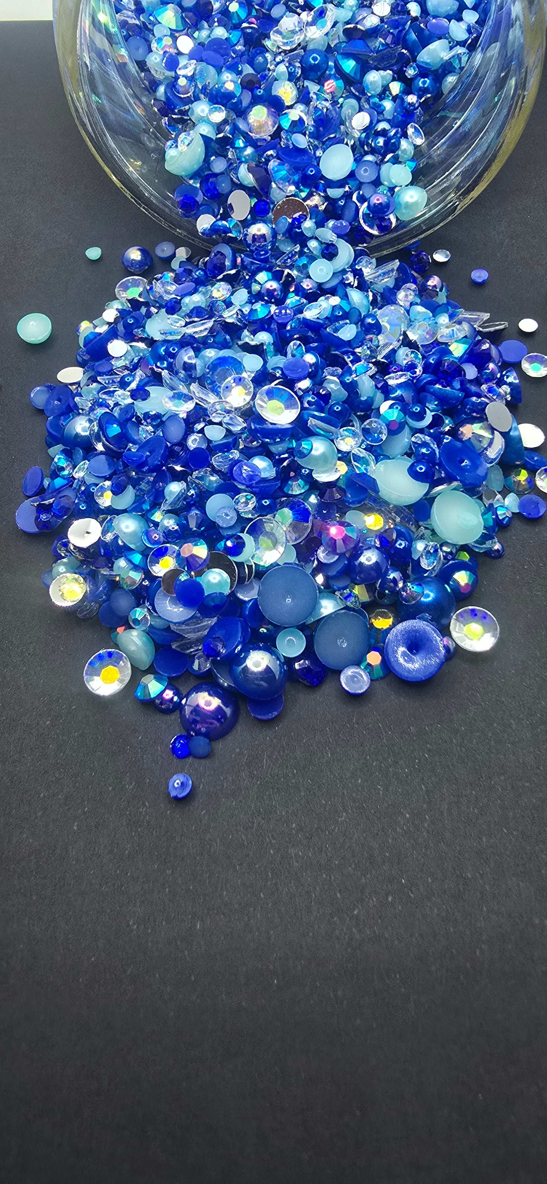 Different colored blue pearl and glass rhinestones, with clear glass rhinestones. 3-10mm in size.